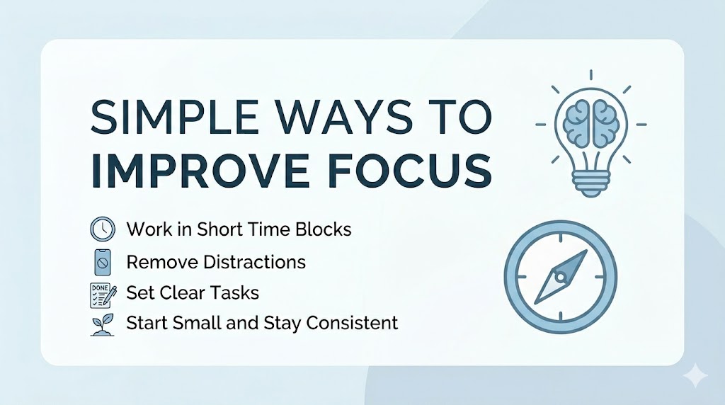 Improving focus doesn’t require major changes. By working in short sessions, reducing distractions, and staying consistent, you can gradually train your brain to stay focused for longer periods.